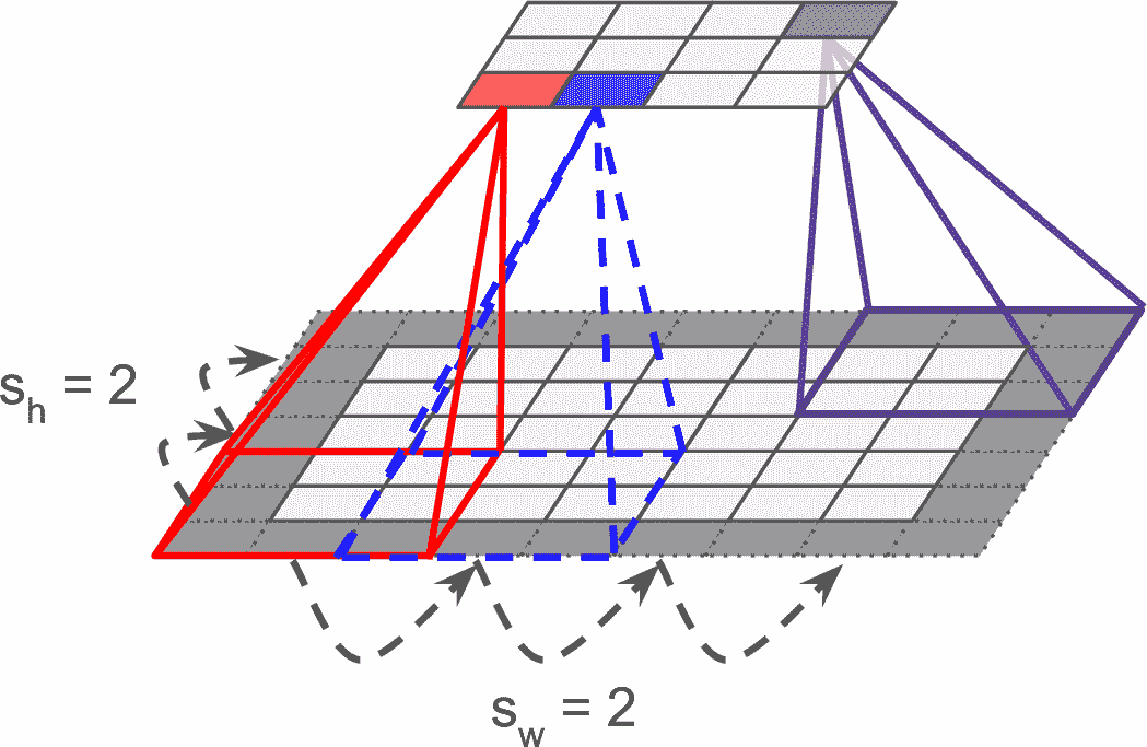 也可以通过间隔感受野,将大输入层和小卷积层连接起来,见图 14-4。这么做可以极大降低模型的计算复杂度。一个感受野到下一个感受野的便宜距离称为步长。在图中,5 × 7的输入层(加上零填充),连接着一个3 × 4的层,使用3 × 3的感受野,步长是 2(这个例子中,宽和高的步长都是 2,但也可以不同)。位于上层第i行、第j列的神经元,连接着前一层的第i × sh到i × sh + fh – 1行、第j × sw到j × sw + fw – 1列的神经元的输出,s[h]和s[w]分别是垂直和水平步长。