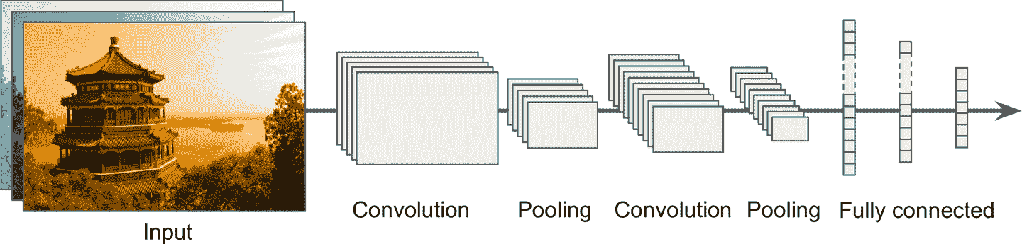 对视神经的研究在 1980 年启发了神经认知学,后者逐渐演变成了今天的卷积神经网络。Yann LeCun 等人再 1998 年发表了一篇里程碑式的论文,提出了著名的 LeNet-5 架构,被银行广泛用来识别手写支票的数字。这个架构中的一些组件,我们已经学过了,比如全连接层、sigmod 激活函数,但 CNN 还引入了两个新组件:卷积层和池化层。