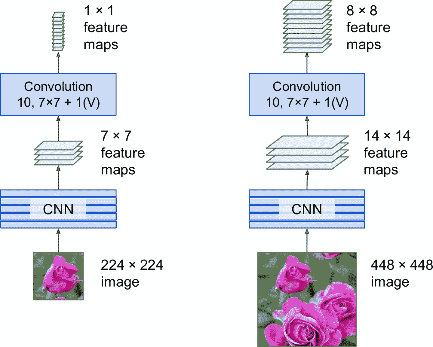 当输入图片为224 × 224时(见图 14-25 的左边),假设输出层前面的最后一个卷积层(也被称为瓶颈层)输出224 × 224的特征映射。如果 FCN 的输入图片是448 × 448(见图 14-25 的右边),瓶颈层会输出224 × 224的特征映射。因为紧密输出层被替换成了 10 个使用大小为224 × 224的过滤器的卷积层,"valid"填充,步长为 1,输出会有 10 个特征映射,每个大小为448 × 448(因为14 – 7 + 1 = 8)。换句话说,FCN 只会处理整张图片一次,会输出224 × 224的网格,每个格子有 10 个数(5 个类概率,1 个对象性分数,4 个边框参数)。就像之前滑动 CNN 那样,每行滑动 8 步,每列滑动 8 步。再形象的讲一下,将原始图片切分成224 × 224的网格,然后用224 × 224的窗口在上面滑动,窗口会有8 × 8 = 64个可能的位置,也就是 64 个预测。但是,FCN 方法又非常高效,因为只需观察图片一次。事实上,“只看一次”(You Only Look Once,YOLO)是一个非常流行的目标检测架构的名字,下面介绍。