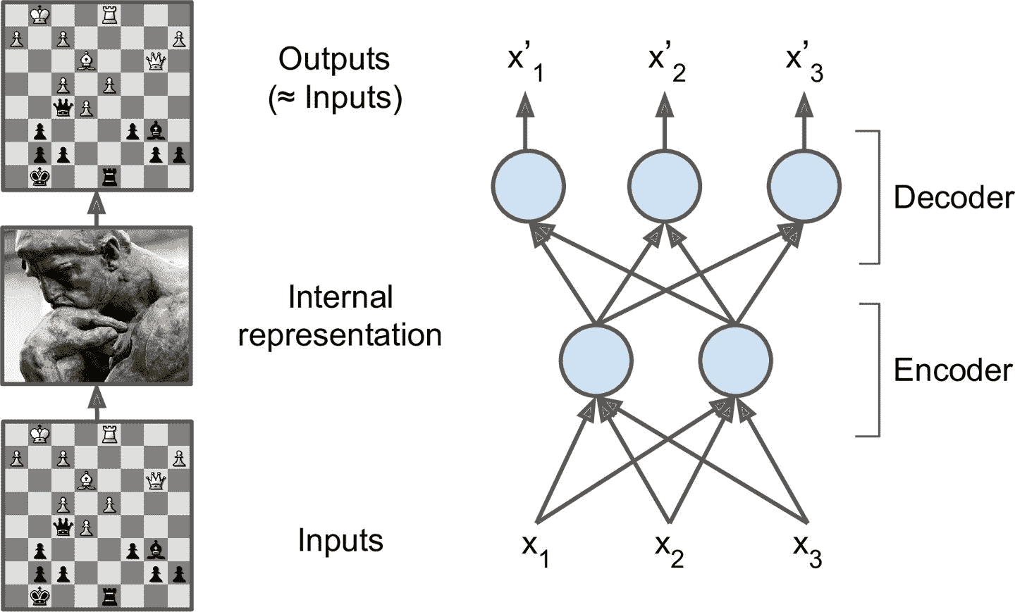 图 17-1 记忆象棋试验(左)和一个简单的自编码器(右)