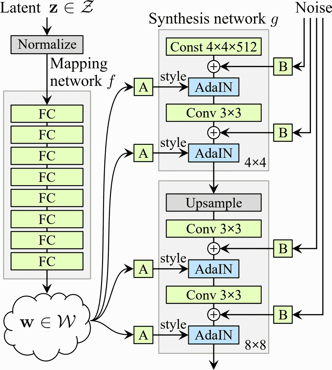 负责生成图片。它有一个固定的学好的输入(这个输入在训练之后是不变的,但在训练中被反向传播更新)。和之前一样,合成网络使用多个卷积核上采样层处理输入,但有两处不同:首先,输入和所有卷积层的输出(在激活函数之前)都添加了噪音。第二,每个噪音层的后面是一个适应实例归一化(AdaIN)层:它独立标准化每个特征映射(减去平均值,除以标准差),然后使用风格向量确定每个特征映射的缩放和偏移(风格向量对每个特征映射包含一个缩放和一个偏置项)。