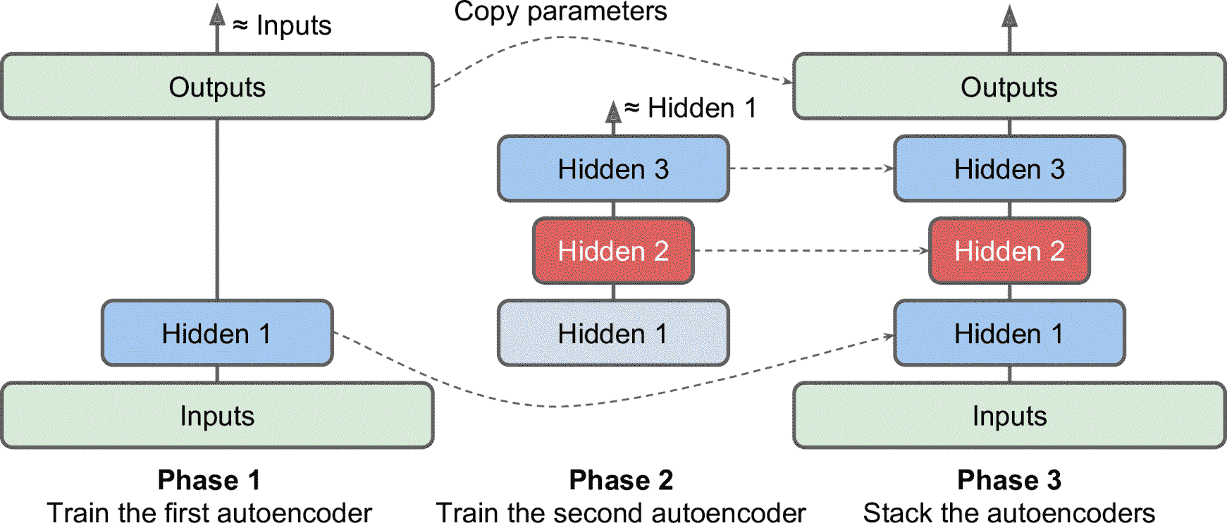 就像我们讨论过的其他神经网络一样,自编码器可以有多个隐藏层。 在这种情况下,它们被称为栈式自编码器(或深度自编码器)。 添加更多层有助于自编码器了解更复杂的编码。 但是,必须注意不要让自编码器功能太强大。 设想一个编码器非常强大,只需学习将每个输入映射到一个任意数字(并且解码器学习反向映射)即可。 很明显,这样的自编码器将完美地重构训练数据,但它不会在过程中学习到任何有用的数据表征(并且它不可能很好地泛化到新的实例)。