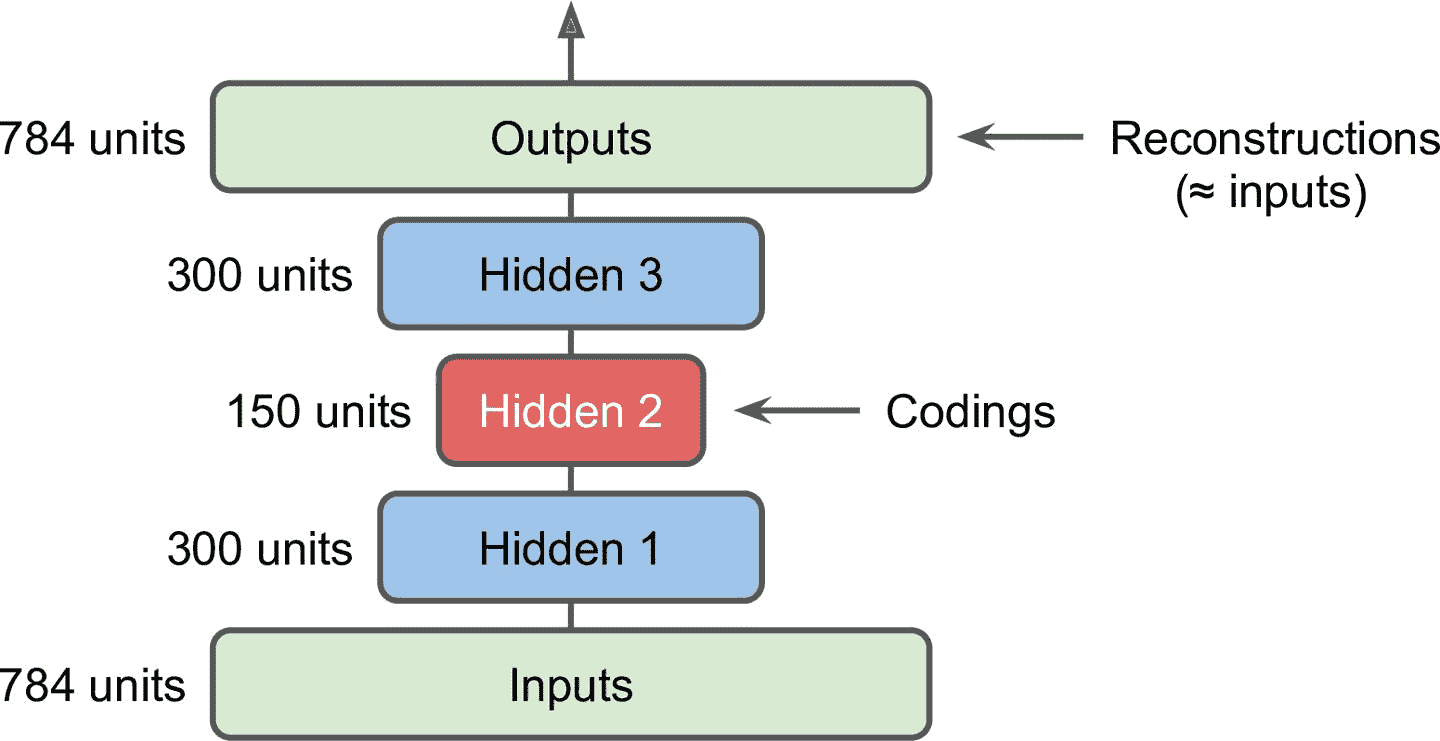 如你所见,自编码器通常具有与多层感知器(MLP,请参阅第 10 章)相同的体系结构,但输出层中的神经元数量必须等于输入数量。 在这个例子中,只有一个由两个神经元(编码器)组成的隐藏层和一个由三个神经元(解码器)组成的输出层。由于自编码器试图重构输入,所以输出通常被称为重建,并且损失函数包含重建损失,当重建与输入不同时,重建损失会对模型进行惩罚。