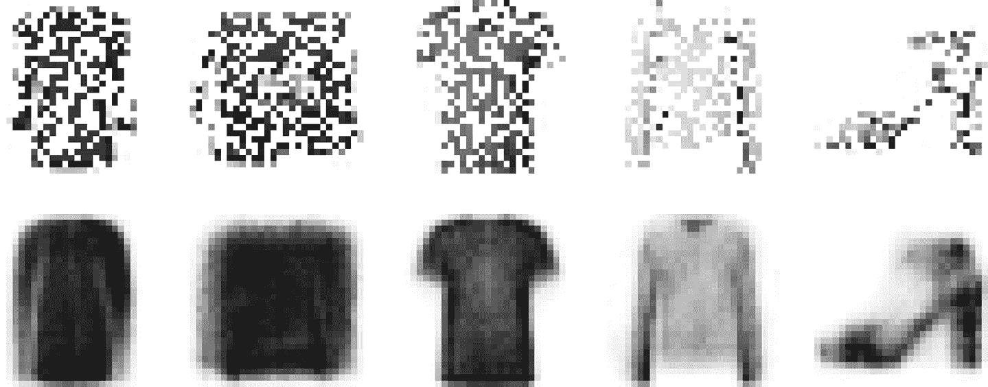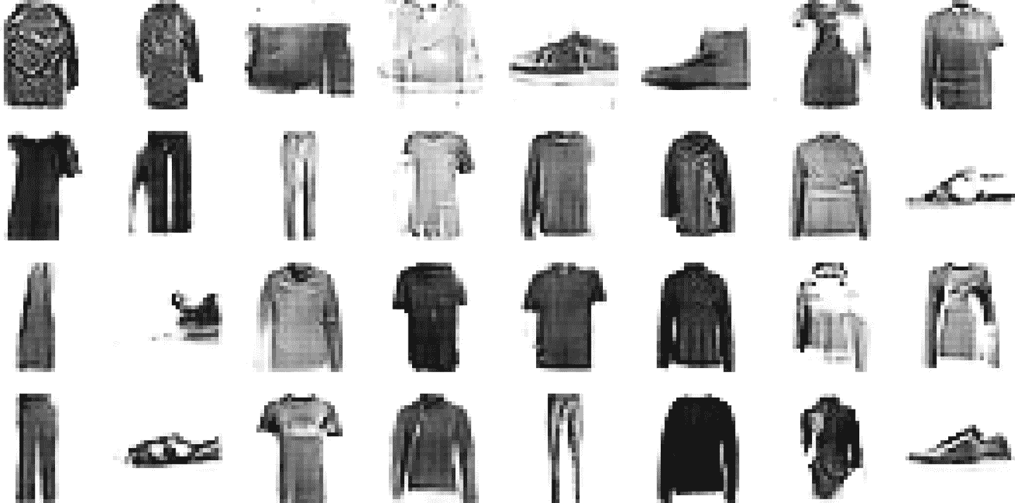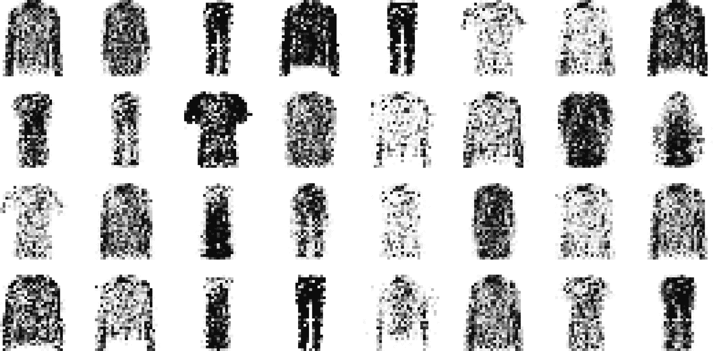 这样就好了!如果展示生成出来的图片(见图 17-16),可以看到在第一个周期的后期,图片看起来已经接近 Fashion MNIST 的图片了。