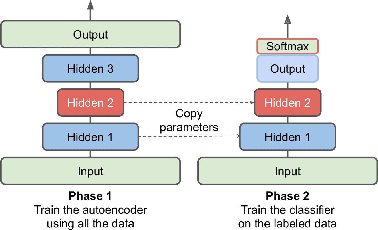 第 11 章讨论过,如果要处理一个复杂的监督任务,但又缺少标签数据,解决的方法之一,是找一个做相似任务的神经网络,复用它的底层。这么做就可以使用少量训练数据训练出高性能的模型,因为模型不必学习所有低层次特征;模型可以复用之前的特征探测器。