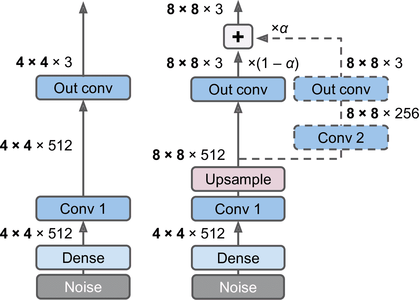 例如,当生成器的输出从4 × 4变为4 × 4时(见图 17-19),在现有的卷积层上加上一个上采样层(使用近邻过滤),使其输出4 × 4的特征映射。再接着传给一个新的卷积层(使用same填充,步长为 1,输出为8 × 8)。接着是一个新的输出卷积层:这是一个常规卷积层,核大小为 1,将输出投影到定好的颜色通道上(比如 3)。为了避免破坏第一个训练好的卷积层的权重,最后的输出是原始输出层(现在的输出是4 × 4的特征映射)的权重之和。新输出的权重是α,原始输出的权重是1-α,α逐渐从 0 变为 1。换句话说,新的卷积层(图 17-19 中的虚线)是淡入的,而原始输出层淡出。向判别器(跟着平均池化层做降采样)添加新卷积层时,也是用相似的淡入淡出方法。