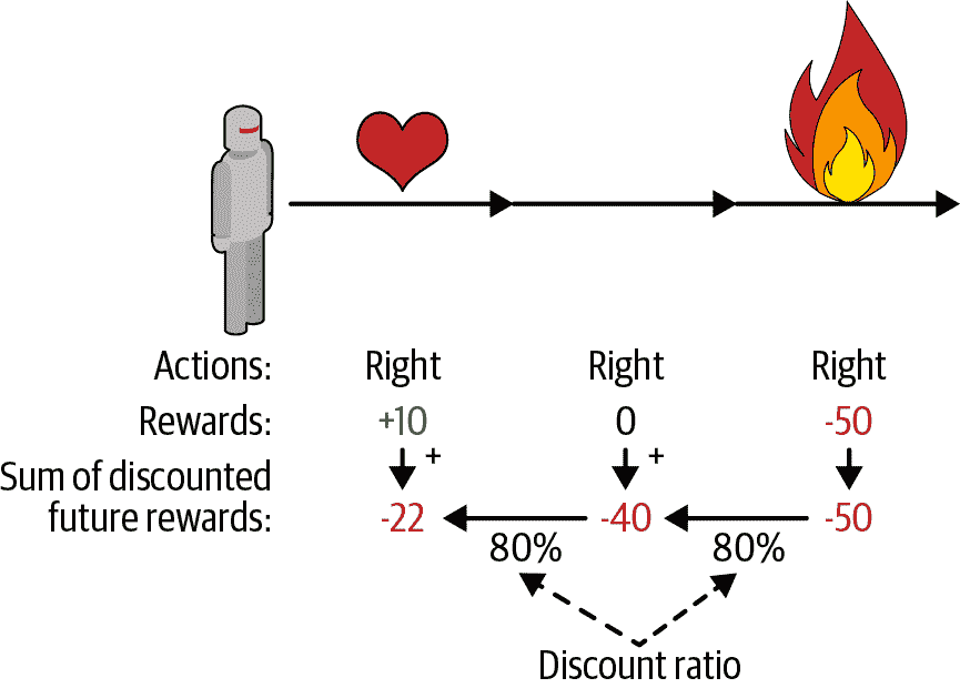 你可能奇怪为什么我们根据神经网络给出的概率来选择随机的动作,而不是选择最高分数的动作。这种方法使智能体在探索新的行为和利用那些已知可行的行动之间找到正确的平衡。举个类比:假设你第一次去餐馆,所有的菜看起来同样吸引人,所以你随机挑选一个。如果菜好吃,你可以增加下一次点它的概率,但是你不应该把这个概率提高到 100%,否则你将永远不会尝试其他菜肴,其中一些甚至比你尝试的更好。