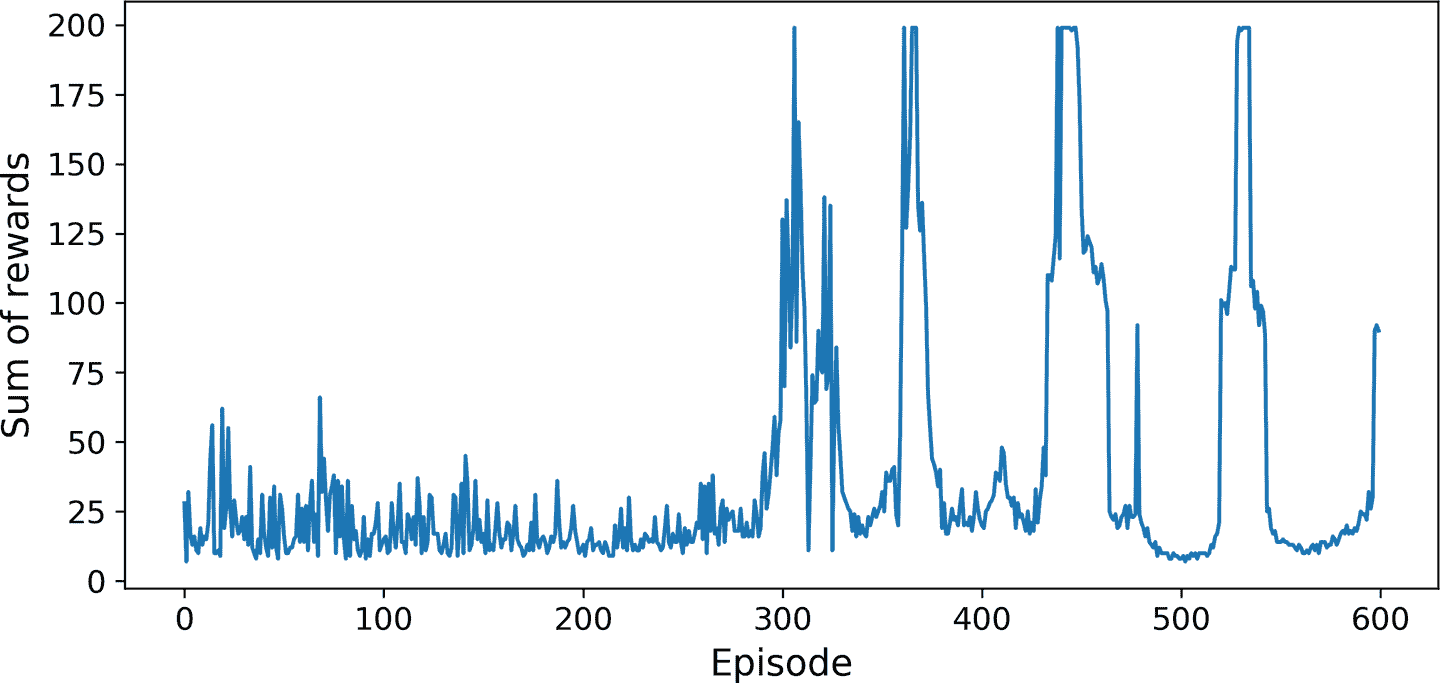 即使有 500 次尝试,这一策略从未使平衡杆在超过 68 个连续的步骤里保持直立。结果太好。如果你看一下 Juyter 笔记本中的模拟,你会发现,推车越来越强烈地左右摆动,直到平衡杆倾斜过度。让我们看看神经网络是否能提出更好的策略。