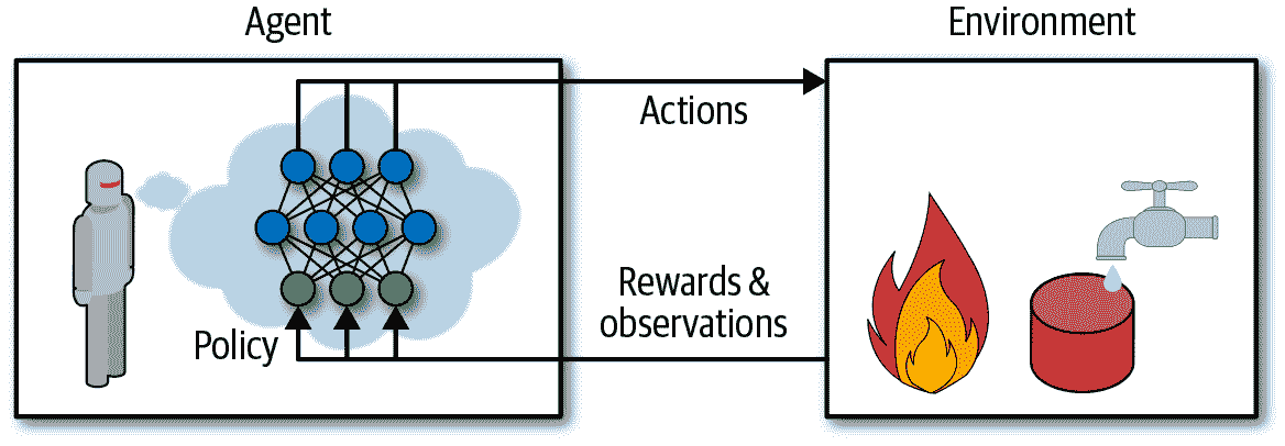 智能体用于改变行为的算法称为策略。例如,策略可以是一个把观测当输入,行为当做输出的神经网络(见图 16-2)。