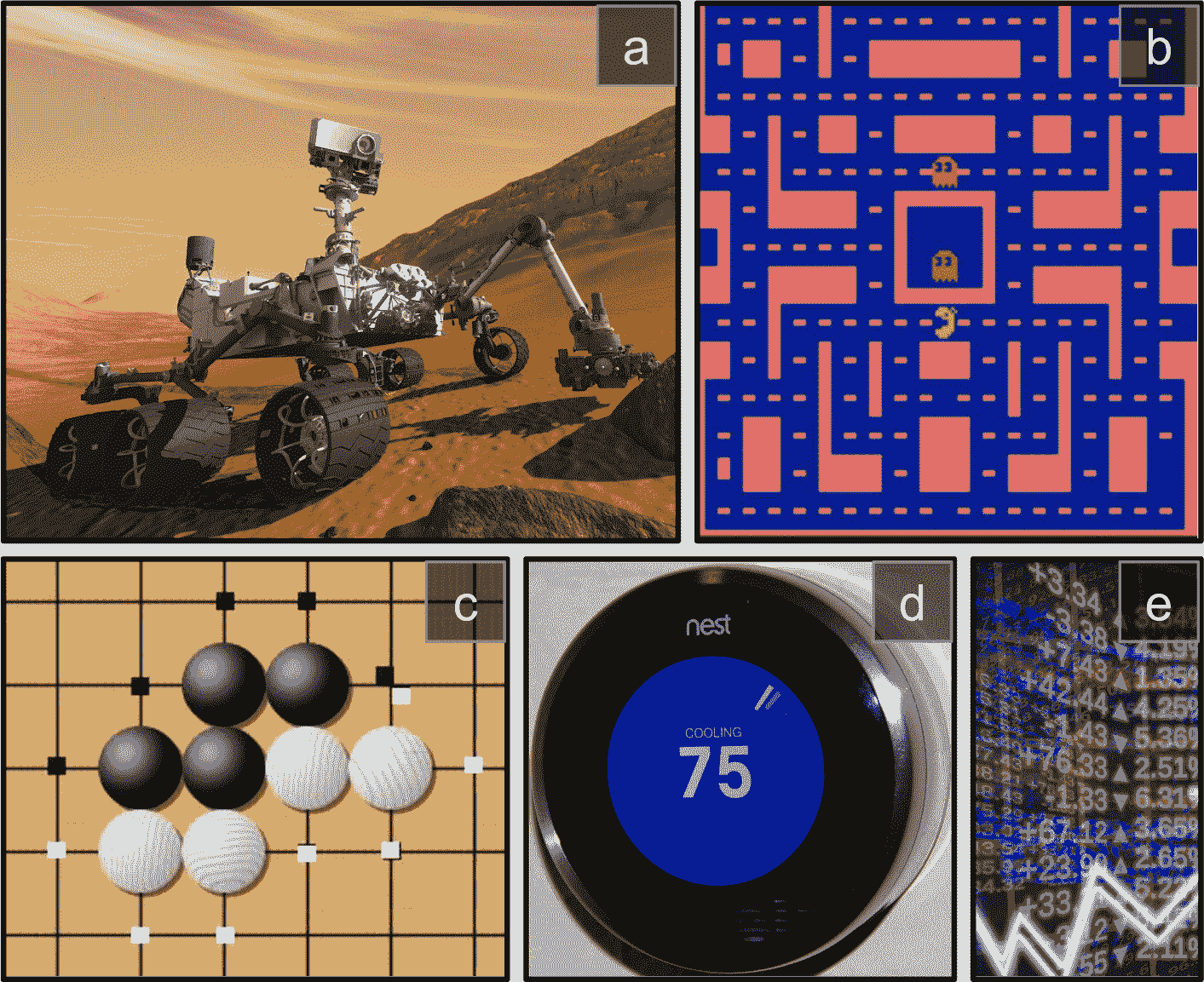 智能体也可以不用去控制一个实体(或虚拟的)去移动。例如它可以是一个智能恒温器,当它调整到目标温度以节能时会得到正奖励,当人们需要自己去调节温度时它会得到负奖励,所以智能体必须学会预见人们的需要。