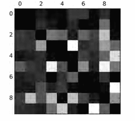 这里是一对数字。使用 Matplotlib 的matshow()函数,将混淆矩阵以图像的方式呈现,将会更加方便。