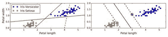 如果我们严格地规定所有的数据都不在“街道”上,都在正确地两边,称为硬间隔分类,硬间隔分类有两个问题,第一,只对线性可分的数据起作用,第二,对异常点敏感。图 5-3 显示了只有一个异常点的鸢尾花数据集:左边的图中很难找到硬间隔,右边的图中判定边界和我们之前在图 5-1 中没有异常点的判定边界非常不一样,它很难一般化。