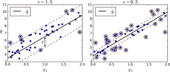 正如我们之前提到的,SVM 算法应用广泛:不仅仅支持线性和非线性的分类任务,还支持线性和非线性的回归任务。技巧在于逆转我们的目标:限制间隔违规的情况下,不是试图在两个类别之间找到尽可能大的“街道”(即间隔)。SVM 回归任务是限制间隔违规情况下,尽量放置更多的样本在“街道”上。“街道”的宽度由超参数ϵ控制。图 5-10 显示了在一些随机生成的线性数据上,两个线性 SVM 回归模型的训练情况。一个有较大的间隔(ϵ=1.5),另一个间隔较小(ϵ=0.5)。