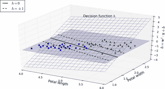图 5-12 显示了和图 5-4 右边图模型相对应的决策函数:因为这个数据集有两个特征(花瓣的宽度和花瓣的长度),所以是个二维的平面。决策边界是决策函数等于 0 的点的集合,图中两个平面的交叉处,即一条直线(图中的实线)