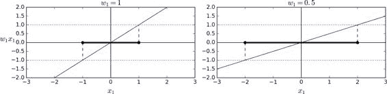 看下决策函数的斜率:它等于权重向量的范数||w||。如果我们把这个斜率除于 2,决策函数等于 ±1 的点将会离决策边界原来的两倍大。换句话,即斜率除于 2,那么间隔将增加两倍。在图 5-13 中,2D 形式比较容易可视化。权重向量w越小,间隔越大。
