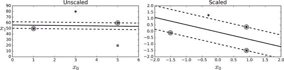 SVM 对特征缩放比较敏感,可以看到图 5-2:左边的图中,垂直的比例要更大于水平的比例,所以最宽的“街道”接近水平。但对特征缩放后(例如使用 Scikit-Learn 的 StandardScaler),判定边界看起来要好得多,如右图。