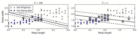 在 Scikit-Learn 库的 SVM 类,你可以用C超参数(惩罚系数)来控制这种平衡:较小的C会导致更宽的“街道”,但更多的间隔违规。图 5-4 显示了在非线性可分隔的数据集上,两个软间隔 SVM 分类器的判定边界。左边图中,使用了较大的C值,导致更少的间隔违规,但是间隔较小。右边的图,使用了较小的C值,间隔变大了,但是许多数据点出现在了“街道”上。然而,第二个分类器似乎泛化地更好:事实上,在这个训练数据集上减少了预测错误,因为实际上大部分的间隔违规点出现在了判定边界正确的一侧。
