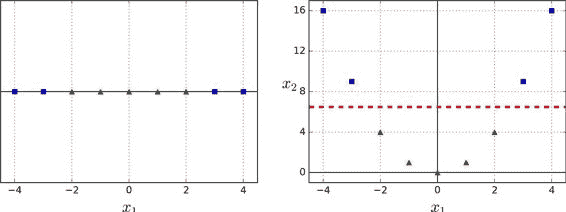 尽管线性 SVM 分类器在许多案例上表现得出乎意料的好,但是很多数据集并不是线性可分的。一种处理非线性数据集方法是增加更多的特征,例如多项式特征(正如你在第 4 章所做的那样);在某些情况下可以变成线性可分的数据。在图 5-5 的左图中,它只有一个特征x1的简单的数据集,正如你看到的,该数据集不是线性可分的。但是如果你增加了第二个特征 x2=(x1)^2,产生的 2D 数据集就能很好的线性可分。