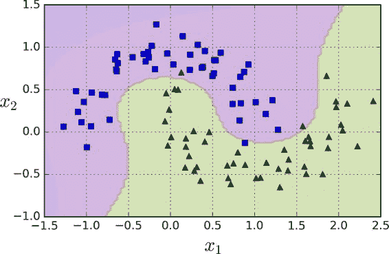 就像多项式特征法一样,相似特征法对各种机器学习算法同样也有不错的表现。但是在所有额外特征上的计算成本可能很高,特别是在大规模的训练集上。然而,“核” 技巧再一次显现了它在 SVM 上的神奇之处:高斯核让你可以获得同样好的结果成为可能,就像你在相似特征法添加了许多相似特征一样,但事实上,你并不需要在 RBF 添加它们。我们使用 SVC 类的高斯 RBF 核来检验一下。
