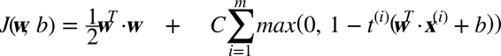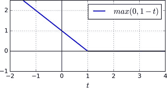 max(0, 1–t)被称为 Hinge 损失函数(如下)。当t≥1时,Hinge 值为 0。如果t<1,它的导数(斜率)为 -1,若t>1,则等于 0。在t=1处,它是不可微的,但就像套索回归(Lasso Regression)(参见 130 页套索回归)一样,你仍然可以在t=0时使用梯度下降法(即 -1 到 0 之间任何值)