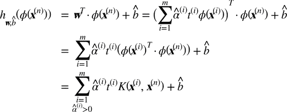 我们还有一个问题要解决。公式 5-7 展示了线性 SVM 分类器如何从对偶解到原始解,如果你应用了核技巧那么得到的公式会包含φ(x^(i))。事实上,w必须和φ(x^(i))有同样的维度,可能是巨大的维度或者无限的维度,所以你很难计算它。但怎么在不知道w的情况下做出预测?好消息是你可以将公式 5-7 的w代入到新的样本x^(n)的决策函数中,你会得到一个在输入向量之间只有点积的方程式。这时,核技巧将派上用场,见公式 5-11