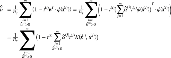注意到支持向量才满足α(i)≠0,做出预测只涉及计算为支持向量部分的输入样本x^(n)的点积,而不是全部的训练样本。当然,你同样也需要使用同样的技巧来计算偏置项b,见公式 5-12