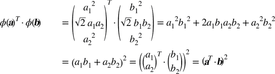 注意到转换后的向量是 3 维的而不是 2 维。如果我们应用这个 2 次多项式映射,然后计算转换后向量的点积(见公式 5-9),让我们看下两个 2 维向量a和b会发生什么。
