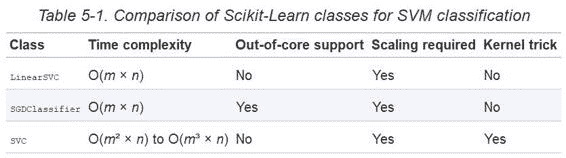 SVC 类基于libsvm库,它实现了支持核技巧的算法。训练时间复杂度通常介于 O(m^2 × n)和O(m^3 × n)之间。不幸的是,这意味着当训练样本变大时,它将变得极其慢(例如,成千上万个样本)。这个算法对于复杂但小型或中等数量的数据集表现是完美的。然而,它能对特征数量很好的缩放,尤其对稀疏特征来说(sparse features)(即每个样本都有一些非零特征)。在这个情况下,算法对每个样本的非零特征的平均数量进行大概的缩放。表 5-1 对 Scikit-learn 的 SVM 分类模型进行比较。